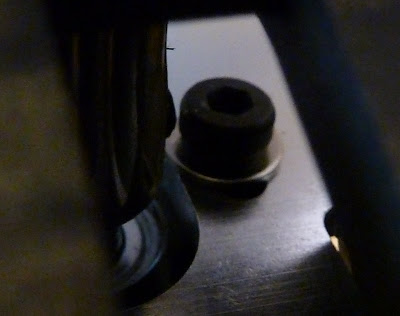 Los tornillos que sujetan el motor me dieron un problema. Como podeis ver en las dos fotos que siguen, uno de ellos se encuentra en la parte anterior de su ranura (la ranura se vé delante del tornillo) y, el otro, mas atrás (la reanura se ve detrás del tornillo) porque la distancia entre las ranuras es menor que la que hay entre los agujeros para los tornillos en el motor. Aún así, aparenta estar bien vertical y centrado. Por cierto, no sabía que en estos motores gira toda la carcasa con el eje menos la pieza superior que es donde se atornilla y me costó creer que funcionaba correctamente.
